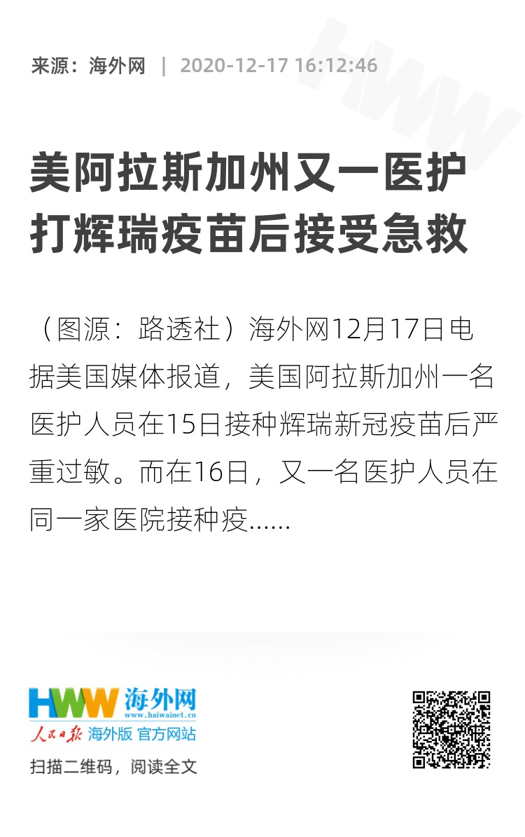 院方表示,截至16日晚已经接种了144剂辉瑞疫苗。阿拉斯加州首席医疗官员安妮·辛克称,目前没有改变接种计划的打算。《纽约时报》指出,虽然辉瑞疫苗临床试验有4.4万人参与,有效率达到了95%,但是阿拉斯加州出现的情况会加剧对疫苗副作用的担忧。专家称,可能会有更多人呼吁加强对接种者不良反应的认真观察。(海外网 赵健行)