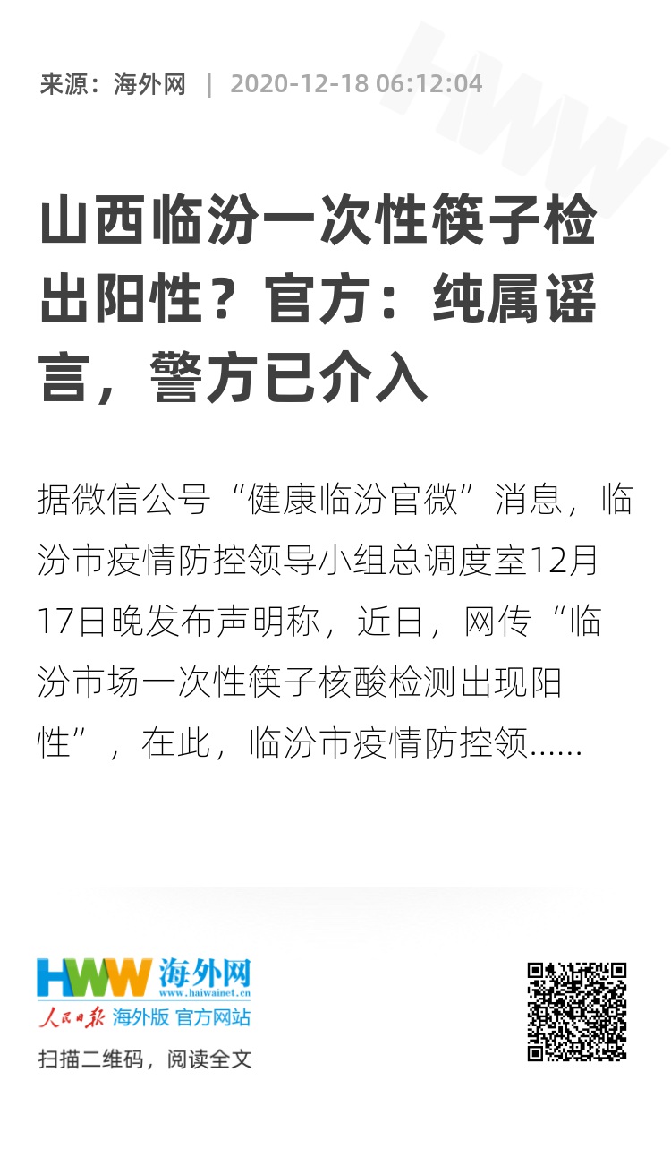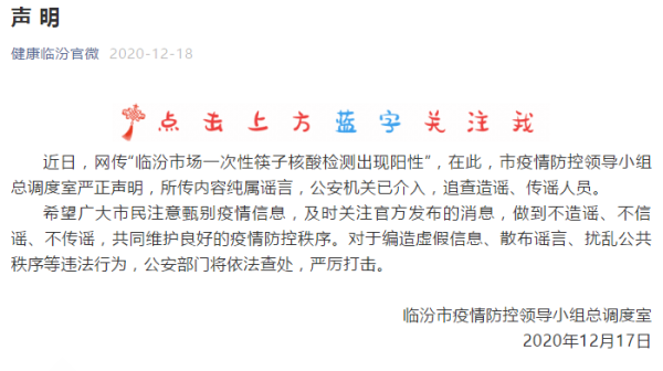 据微信公号“健康临汾官微”消息,临汾市疫情防控领导小组总调度室12月17日晚发布声明称,近日,网传“临汾市场一次性筷子核酸检测出现阳性”,在此,临汾市疫情防控领导小组总调度室严正声明,所传内容纯属谣言,公安机关已介入,追查造谣、传谣人员。