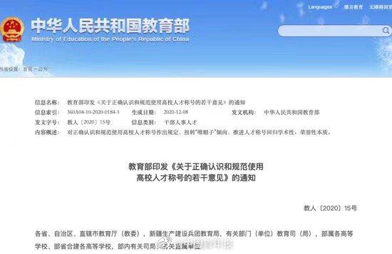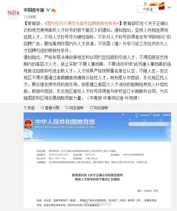 教育部印发《关于正确认识和规范使用高校人才称号的若干意见》的通知。通知指出,坚持人岗相适原则延揽人才,不将人才称号作为硬性指标,不针对人才称号获得者发布“明码标价”的招聘广告。要统筹用好国内外人才资源,不将国(境)外学习或工作经历作为人才招聘引进的限制性条件。