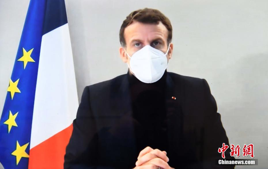当地时间12月17日晚,法国总统马克龙在确诊感染新冠病毒后首次露面,通过视频连线方式出席会议并发表讲话。法国官方当晚披露了马克龙感染病毒的具体症状。马克龙当天新冠病毒检测结果为阳性。图为马克龙视频讲话画面。中新社记者 李洋 摄