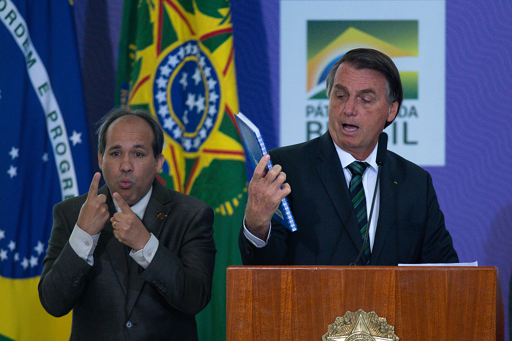 当地时间2020年12月16日,巴西首都巴西利亚,巴西总统博尔索纳罗出席国家疫苗实施计划活动现场,并发表讲话。图片来源:人民视觉/视觉中国