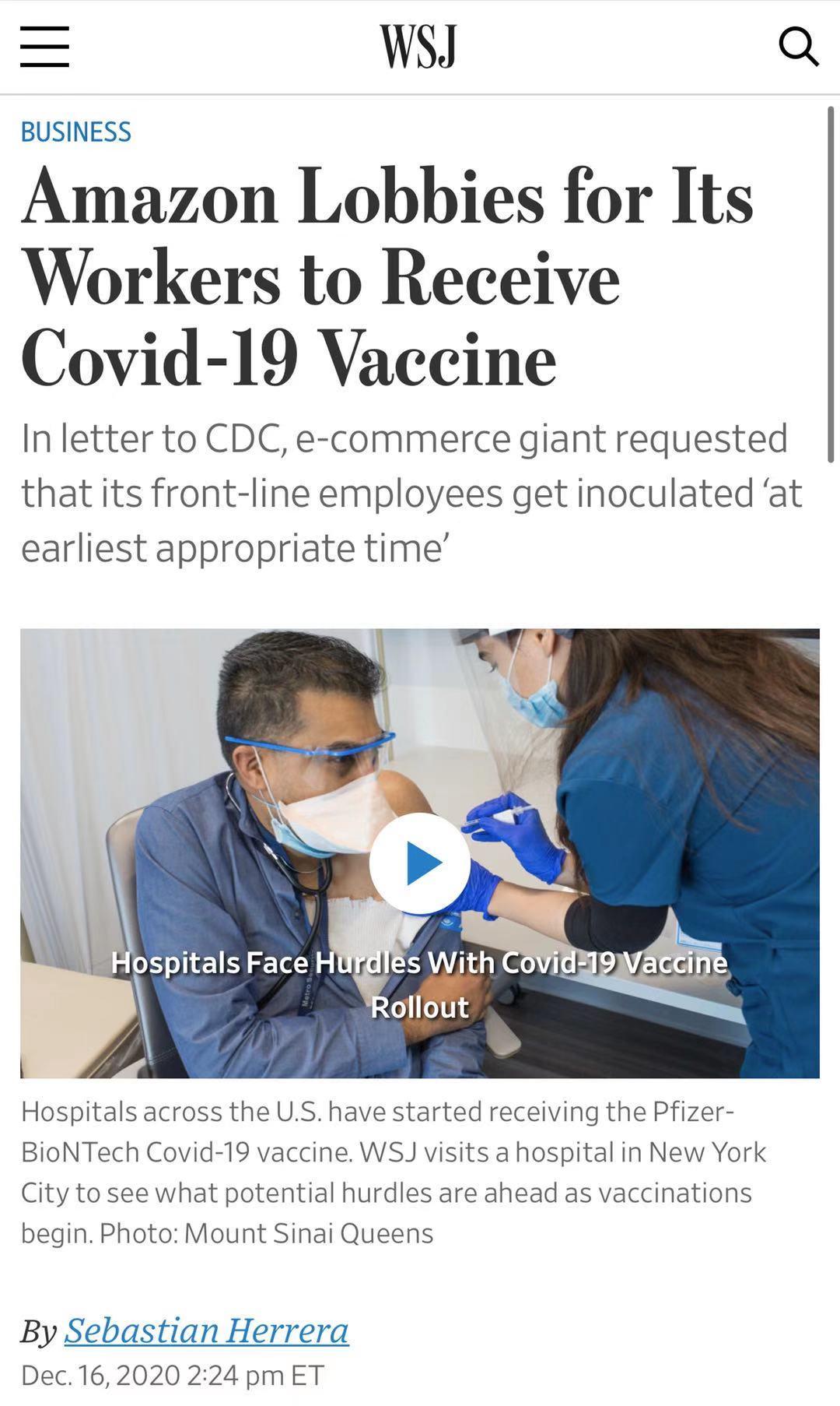 △《华尔街日报》报道,亚马逊公司正在游说政府,试图提早获得疫苗