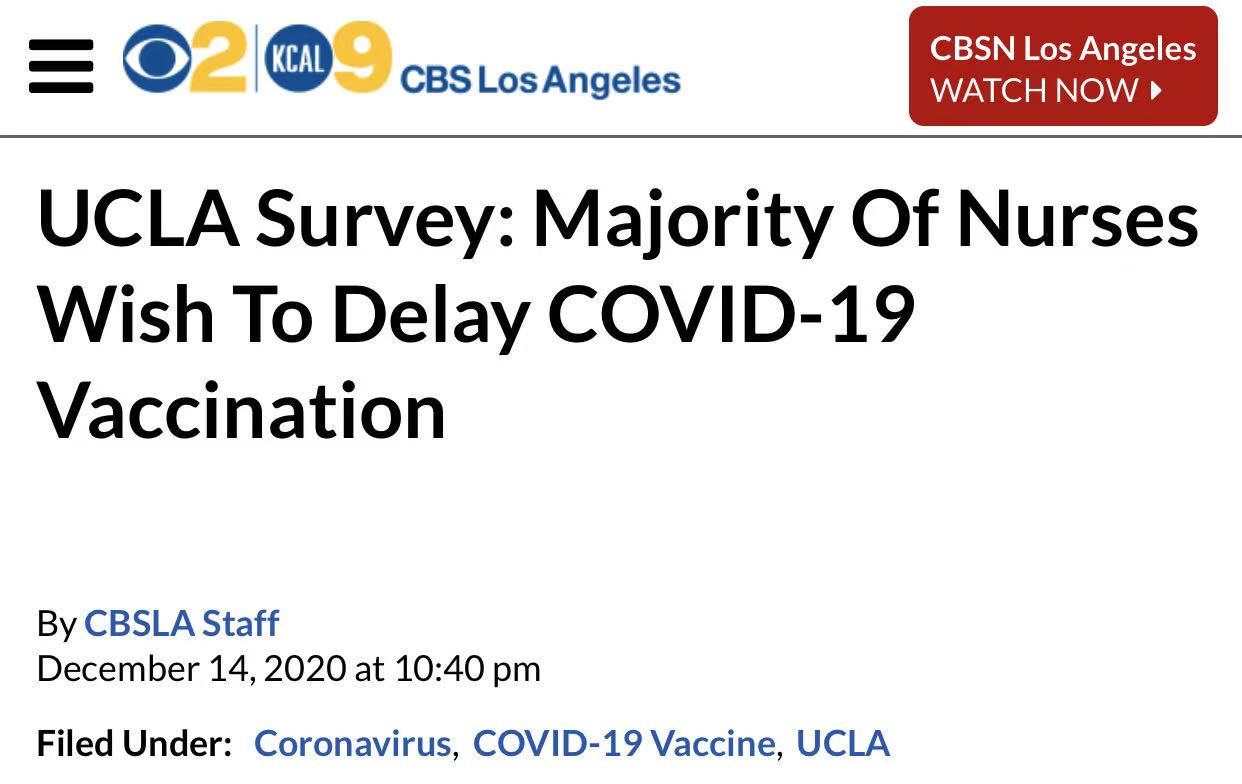 美国加州大学洛杉矶分校对当地医护人员进行调查后发现,许多医护人员对疫苗持保留态度。三分之二医护人员希望推迟疫苗接种或不愿接种;超过半数则认为,联邦政府施压导致了疫苗研发过于仓促,使得他们对疫苗的信任度大打折扣。
