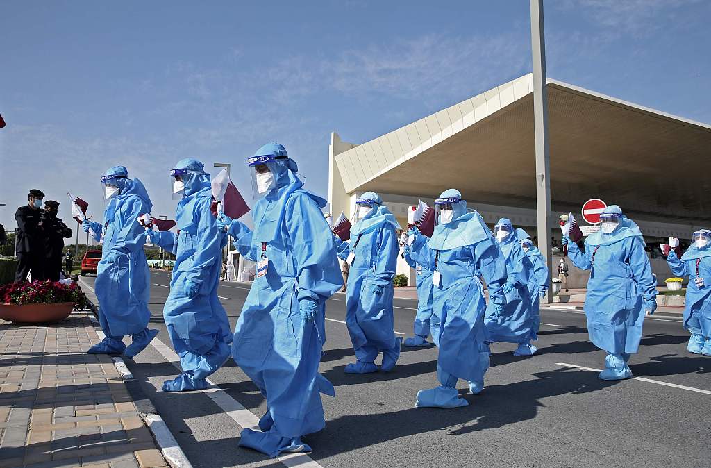 当地时间2020年12月18日,卡塔尔多哈举行国庆阅兵式,医护人员参加阅兵。图片来源:人民视觉/视觉中国