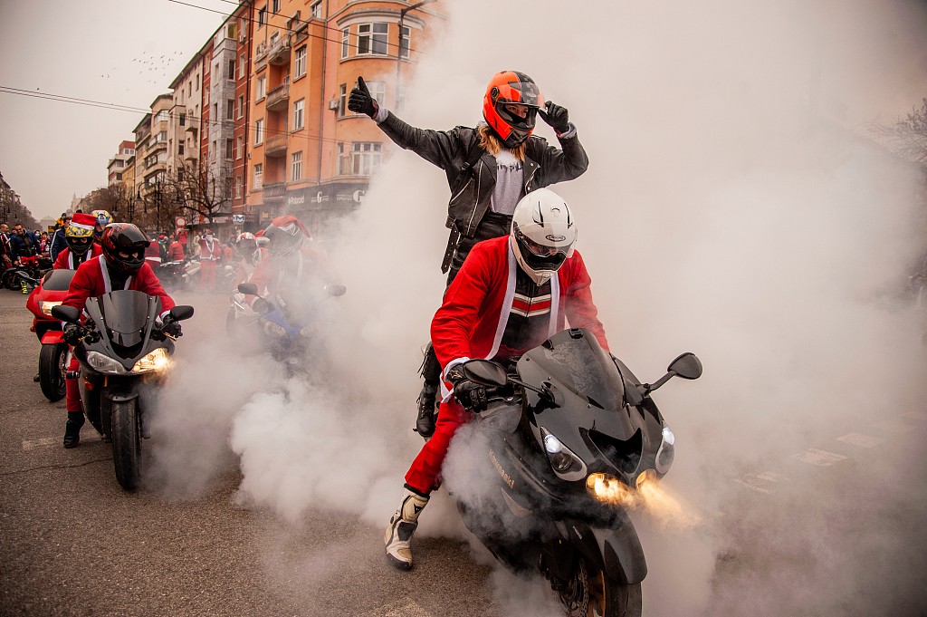 圣诞老人骑摩托?保加利亚举行年度“圣诞老人”机车巡游