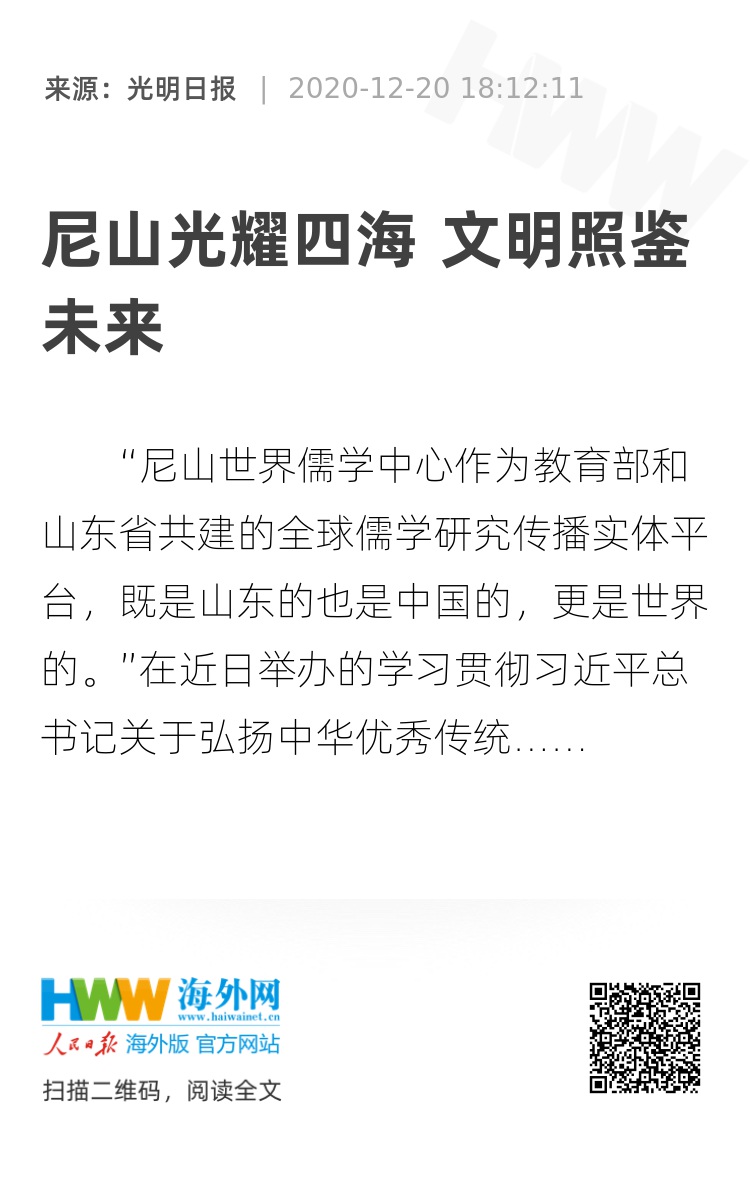 儒学源自尼山,但属于世界。前不久,2020中国(曲阜)国际孔子文化节、第六届尼山世界文明论坛在这里举行。来自17个国家和地区的160多位专家学者、嘉宾,齐聚儒家思想的源头尼山,围绕“文明照鉴未来”,展开交流对话,深入挖掘古老文明的深邃智慧,共同探索多元文明的相融途径。