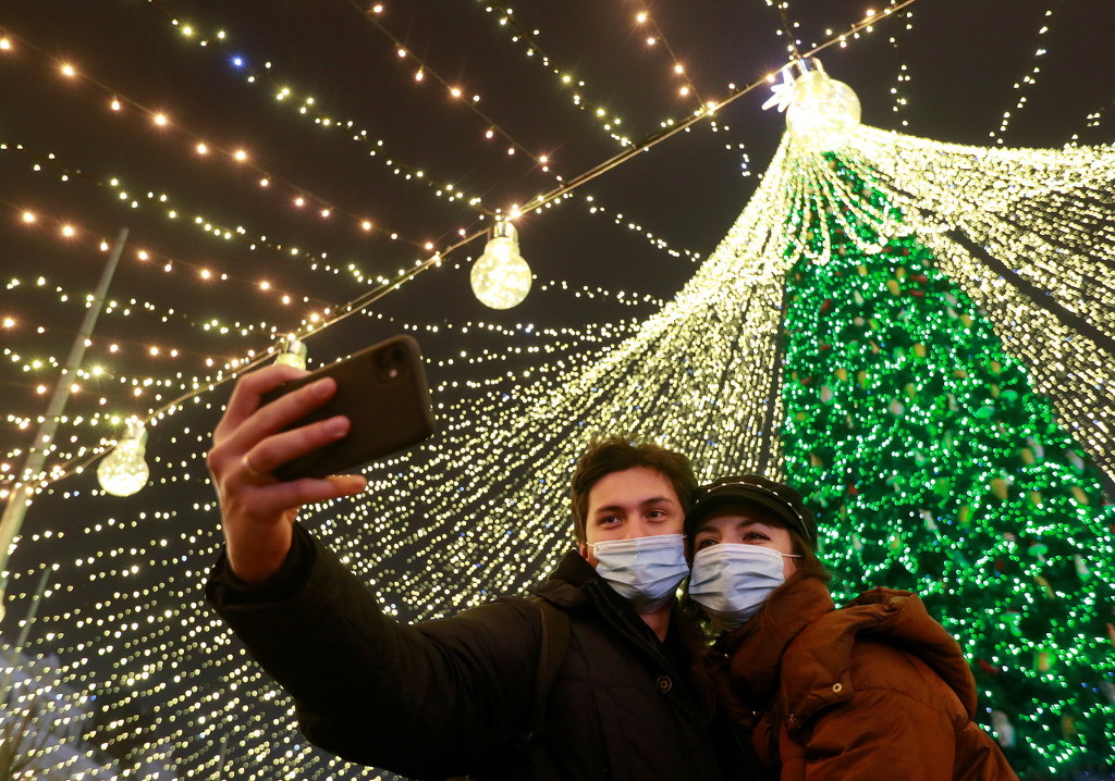 乌克兰基辅点亮大型圣诞装置 情侣甜蜜合影