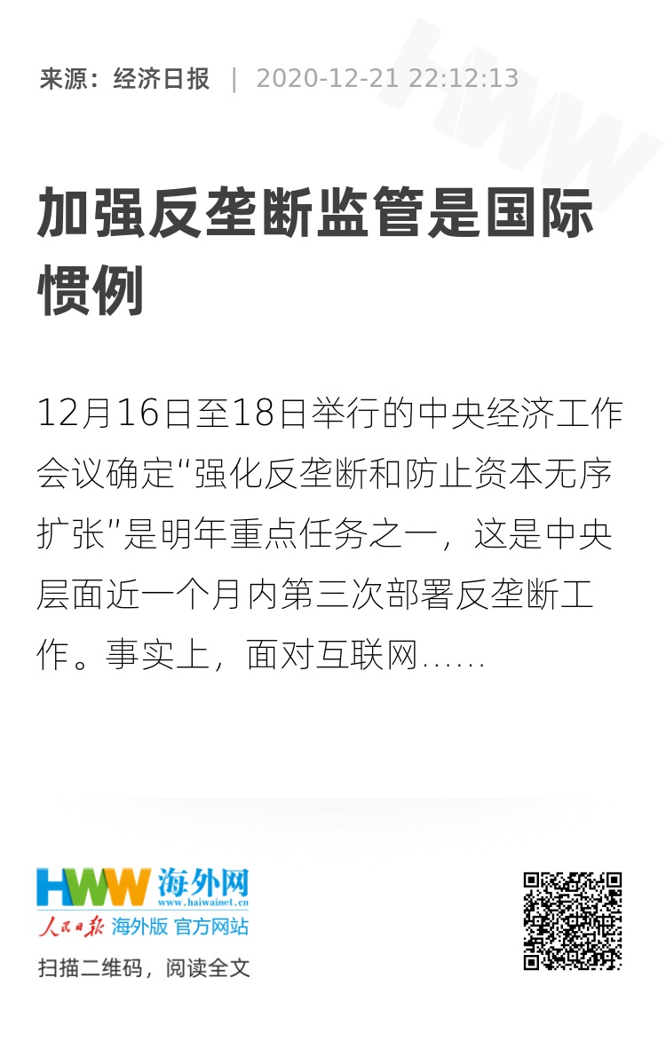 12月16日至18日举行的中央经济工作会议确定“强化反垄断和防止资本无序扩张”是明年重点任务之一,这是中央层面近一个月内第三次部署反垄断工作。事实上,面对互联网这个“超级平台”,世界各国和经济体反垄断执法机构均采取了强硬的监管态度和制约措施,加强反垄断监管成为全球趋势。