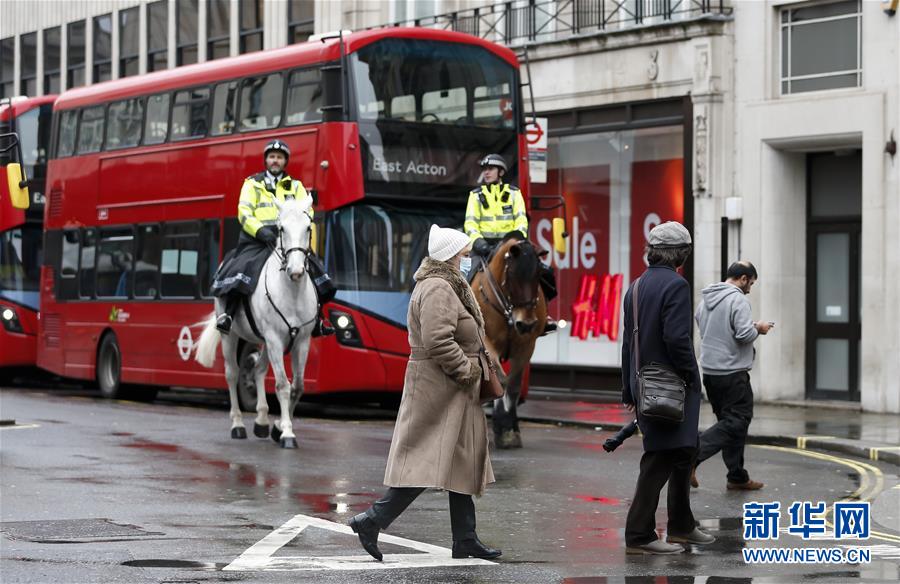 12月21日,人们从英国伦敦街头巡逻的骑警旁走过。 圣诞节临近,英国部分地区新冠病毒传播速度加快,疫情令人担忧。英国政府正在调查这一状况是否与一种变异的新冠病毒有关,并将首都伦敦、英格兰东南部和东部部分地区的新冠疫情防控级别从第三级提升至新增加的第四级。 新华社记者 韩岩 摄