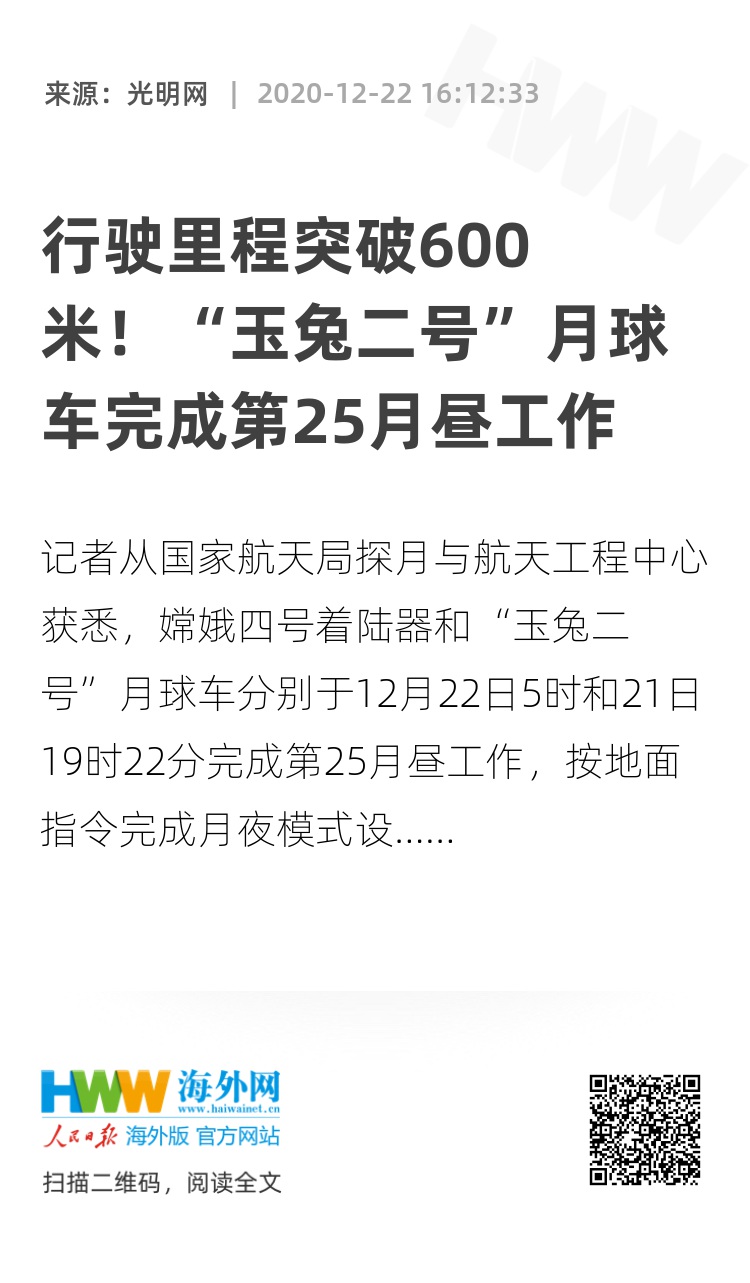 记者从国家航天局探月与航天工程中心获悉,嫦娥四号着陆器和“玉兔二号”月球车分别于12月22日5时和21日19时22分完成第25月昼工作,按地面指令完成月夜模式设置,进入月夜休眠。截至今天,嫦娥四号着陆器和“玉兔二号”月球车已在月面工作719天,月球车累计行驶600.55米。(记者胡喆)