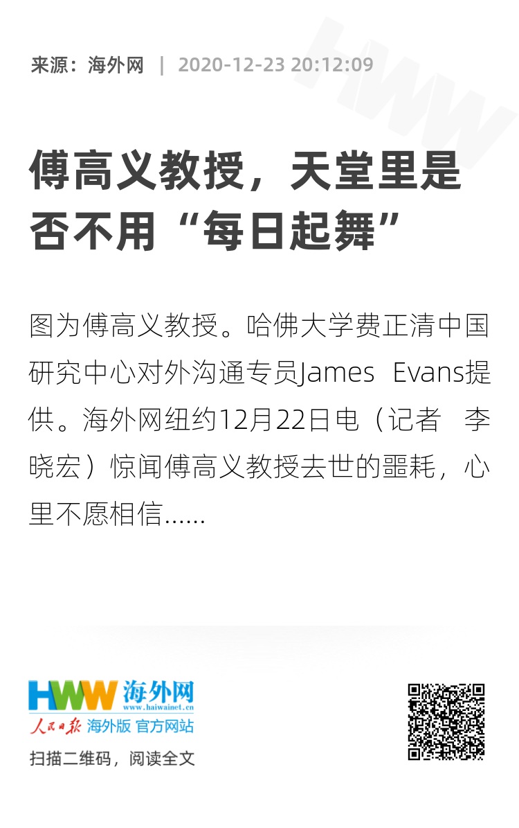 2020年12月20日,天寒地冷。美国东北部入冬以来最大的一场降雪尚未消融,全美当日近22万的新冠肺炎确诊病例持续着疫情的严峻。在马萨诸塞州剑桥的奥本山医院,90岁的傅高义因术后并发症辞世。月光下,白雪覆盖的大地静悄悄的。内心里,我为而驾鹤西去的老教授默默送行。