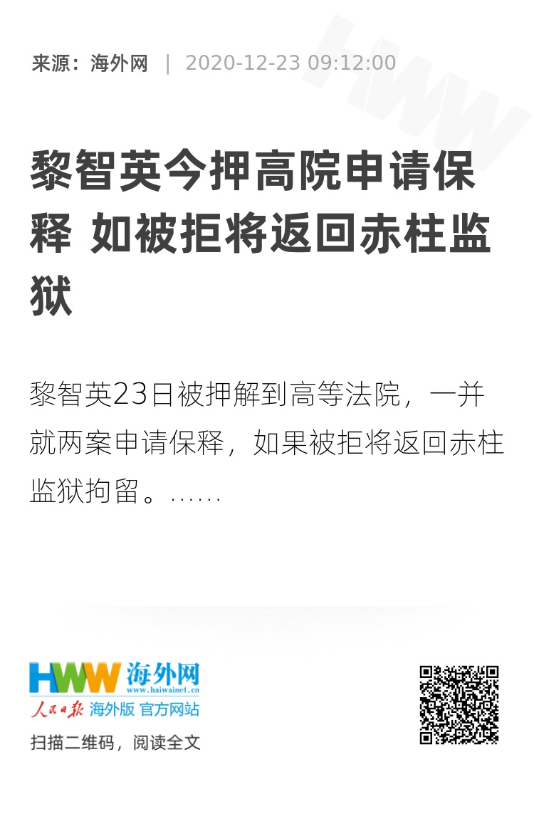 在还押期间,黎智英再遭落案控告勾结外国或者境外势力危害国家安全罪,于12月12日再被押到西九龙法院提堂,当日他也申请保释,但再遭法官以他有机会在保释期间再犯案为理由拒绝让他担保外出。该案同样押后至明年4月16日再讯。 (海外网 张琪)