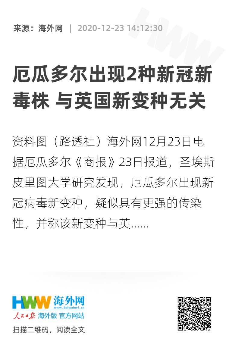 海外网12月23日电 据厄瓜多尔《商报》23日报道,圣埃斯皮里图大学研究发现,厄瓜多尔出现新冠病毒新变种,疑似具有更强的传染性,并称该新变种与英国出现的新冠病毒新变种无关。