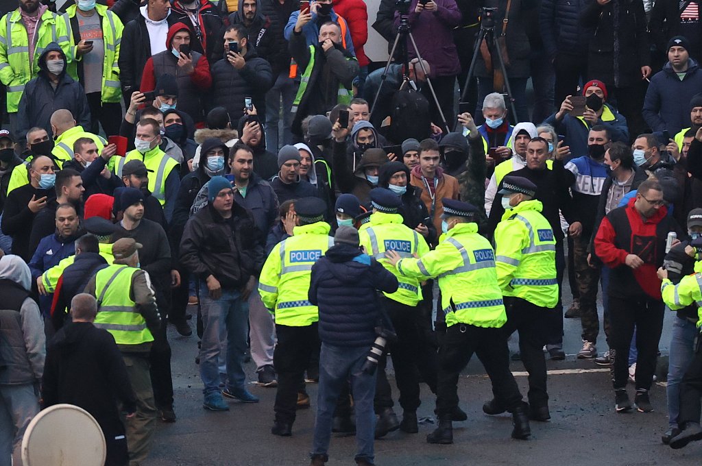 当地时间2020年12月23日,英国多佛港,公路陷入拥堵,多名司机走到公路上与警察交谈。当天,法国向英国重开边界。22日,法国和英国达成一致,23日起允许部分人员从英国入境法国。这意味着过去两天困在英国的欧洲卡车司机和其他欧洲旅客有望在圣诞节前回到家中。图片来源:人民视觉/视觉中国