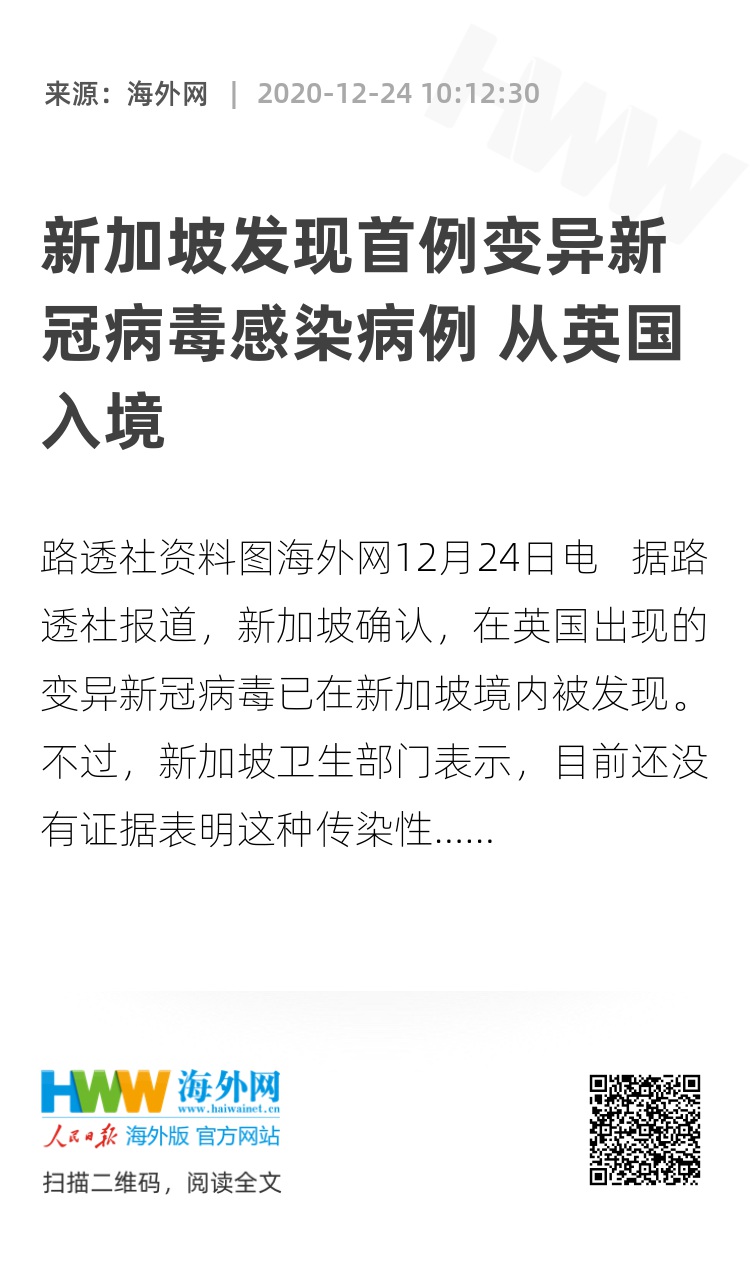 海外网12月24日电 据路透社报道,新加坡确认,在英国出现的变异新冠病毒已在新加坡境内被发现。不过,新加坡卫生部门表示,目前还没有证据表明这种传染性更强的新毒株正在该国社区内传播。