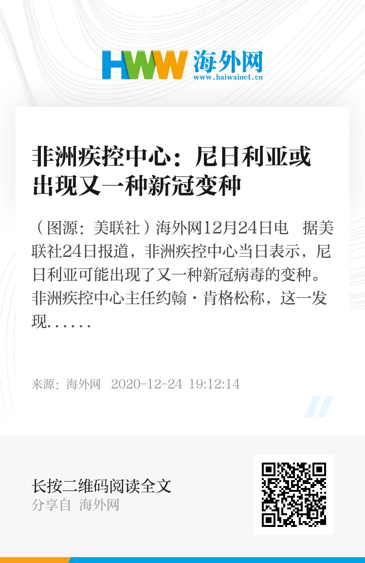 海外网12月24日电 据美联社24日报道,非洲疾控中心当日表示,尼日利亚可能出现了又一种新冠病毒的变种。