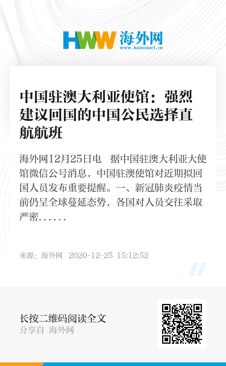 海外网12月25日电 据中国驻澳大利亚大使馆微信公号消息,中国驻澳使馆对近期拟回国人员发布重要提醒。