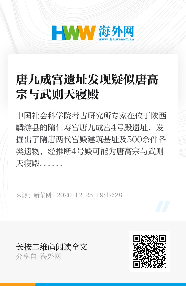 中国社会科学院考古研究所专家在位于陕西麟游县的隋仁寿宫唐九成宫4号殿遗址,发掘出了隋唐两代宫殿建筑基址及500余件各类遗物,经推断4号殿可能为唐高宗与武则天寝殿。