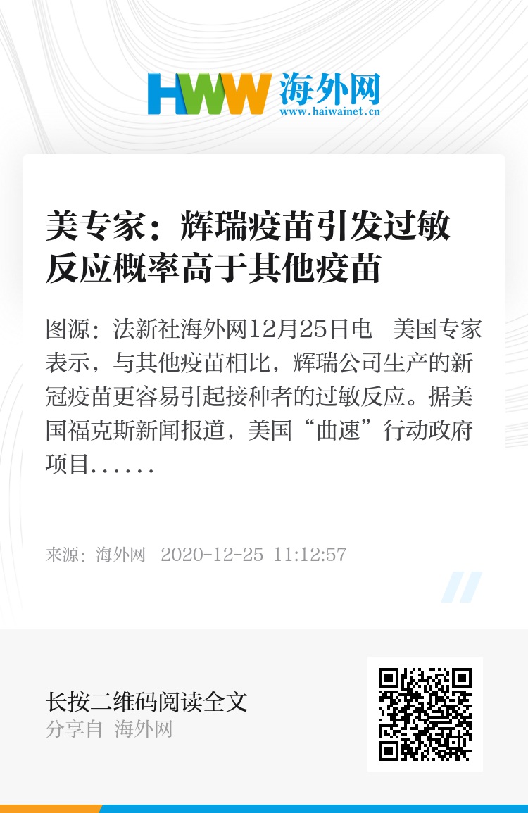 海外网12月25日电 美国专家表示,与其他疫苗相比,辉瑞公司生产的新冠疫苗更容易引起接种者的过敏反应。