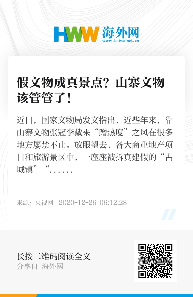 近日,国家文物局发文指出,近些年来,靠山寨文物张冠李戴来“蹭热度”之风在很多地方屡禁不止。放眼望去,各大商业地产项目和旅游景区中,一座座被拆真建假的“古城镇”“长城”“兵马俑”“阿房宫”,乃至“狮身人面像”,都曾堂而皇之地出现。