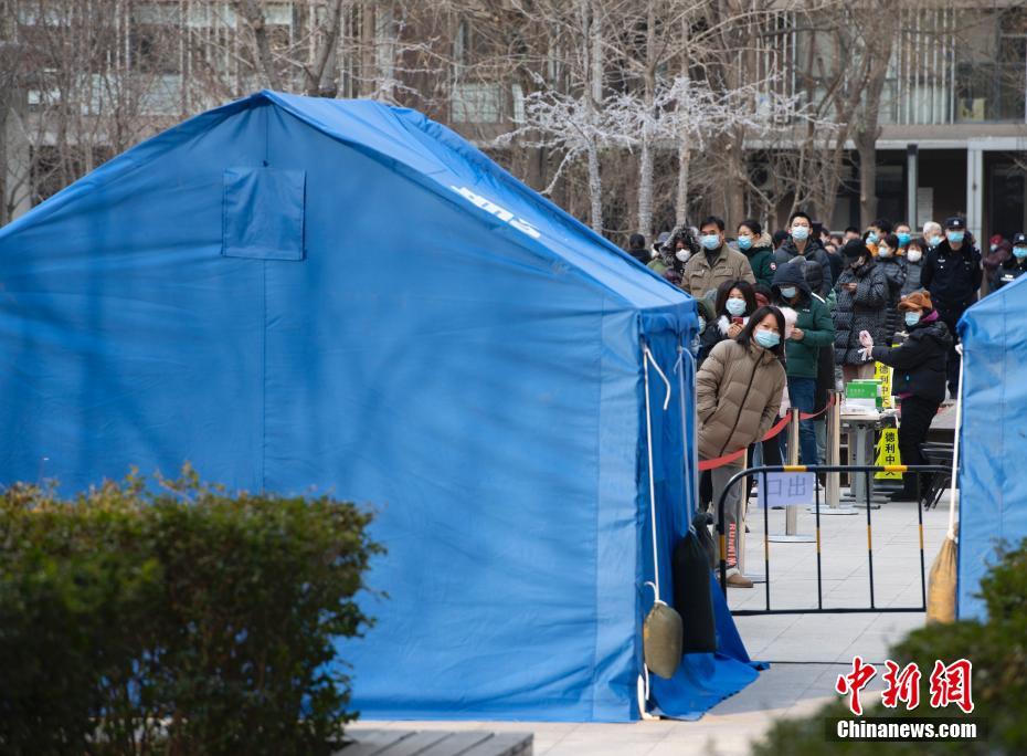 12月26日,根据新冠肺炎疫情防控要求,北京市朝阳区望京地区望京街道、东湖街道开展为期两天的社区全员核酸检测。图为居民在望京街道一处小区内的采样点排队等待核酸检测采样。 中新社记者 侯宇 摄