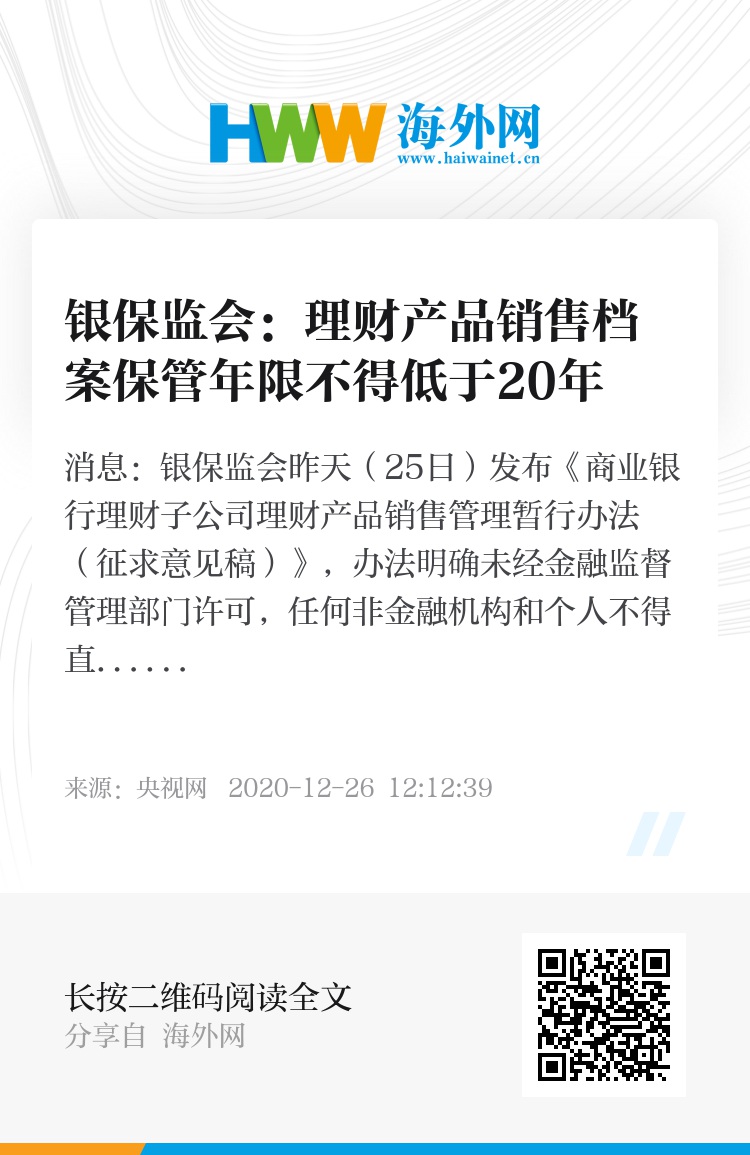 央视网消息:银保监会昨天(25日)发布《商业银行理财子公司理财产品销售管理暂行办法(征求意见稿)》,办法明确未经金融监督管理部门许可,任何非金融机构和个人不得直接或变相代理销售理财产品。理财产品销售机构不得以理财的名义或使用“理财”字样开展其他金融产品销售业务活动。理财产品销售档案保管年限不得低于20年。
