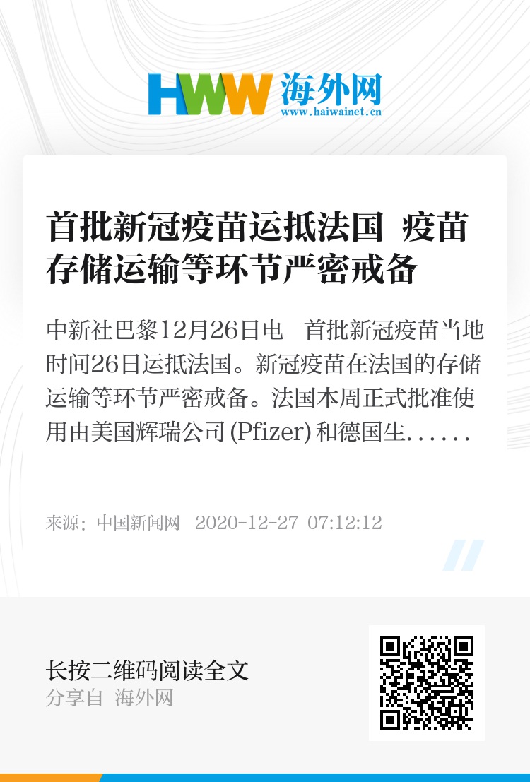 法国本周正式批准使用由美国辉瑞公司(Pfizer)和德国生物新技术公司(BioNTech)联合研发的新冠疫苗。首批新冠疫苗19500剂26日从辉瑞公司在比利时的生产基地发货,通过专门的冷藏货车送抵巴黎的中央药房。