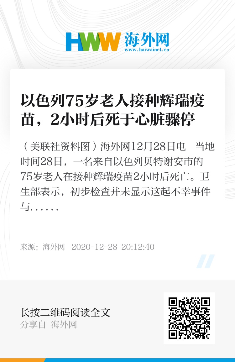 据以色列国家新闻网站28日报道,这名男子于当天早上8:30接种辉瑞疫苗,留观后并未出现不良反应,于是回到家中。约2小时后,该男子突然失去意识,后被证实死于心力衰竭。