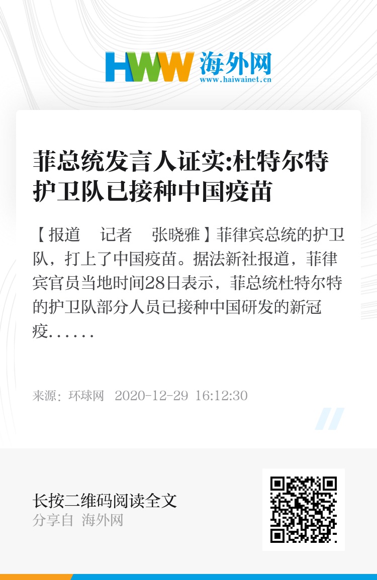 报道说,与此同时,菲律宾总统发言人哈里•罗克也证实说,上述人员接种的是由中国国药集团研发的新冠疫苗。