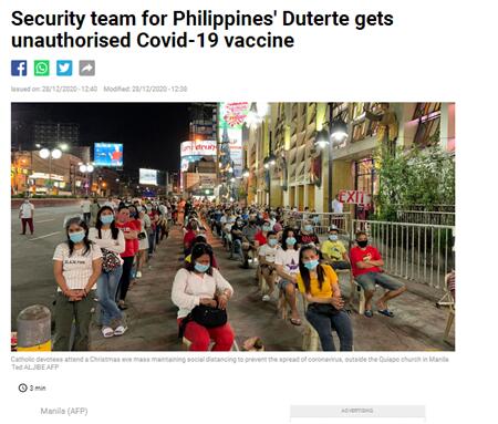 (法新社:菲律宾总统杜特尔特的安全团队接种了暂未经授权的新冠疫苗)