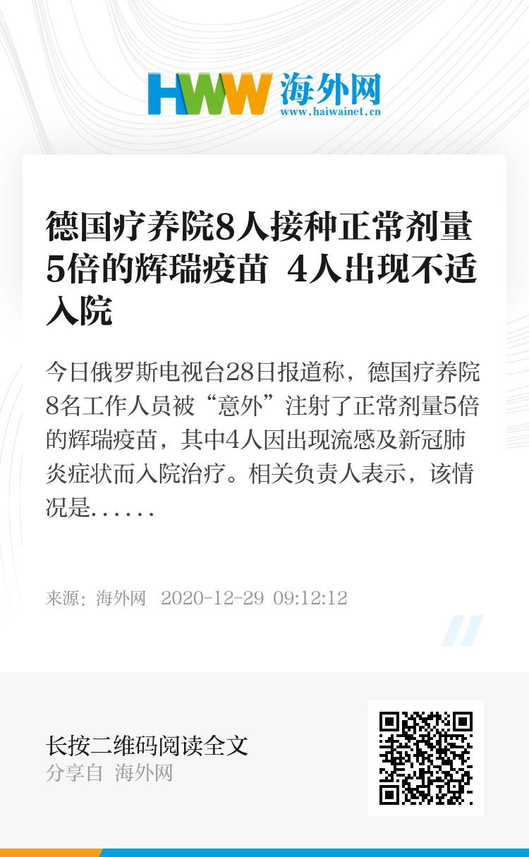当地时间27日,德国东北部城镇斯特拉尔松德(Stralsund)一家疗养院8名工作人员接种了正常剂量(30微克)5倍的辉瑞疫苗,也就是150微克。这8人中7名女性、1名男性,年龄在38岁到54岁之间。这起“事故”发生在德国开始为医护人员和高龄老人接种疫苗的第一天。
