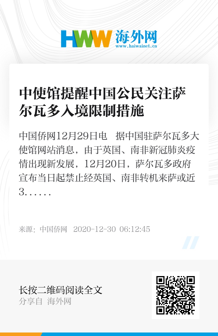 中国驻萨尔瓦多使馆提醒中国公民密切关注并认真遵守萨相关防疫规定和入境政策,特别是关注近期萨政府对来自或经停疫情严重国家旅客的入境限制,坚持“非必要、不旅行”的原则。如近期有来萨计划,请合理安排行程和路线,避免入境时受阻。