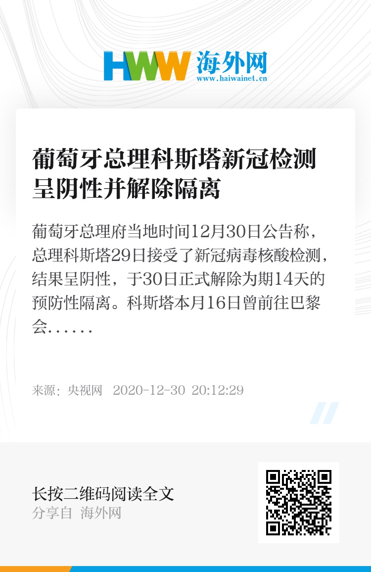 葡萄牙总理府当地时间12月30日公告称,总理科斯塔29日接受了新冠病毒核酸检测,结果呈阴性,于30日正式解除为期14天的预防性隔离。