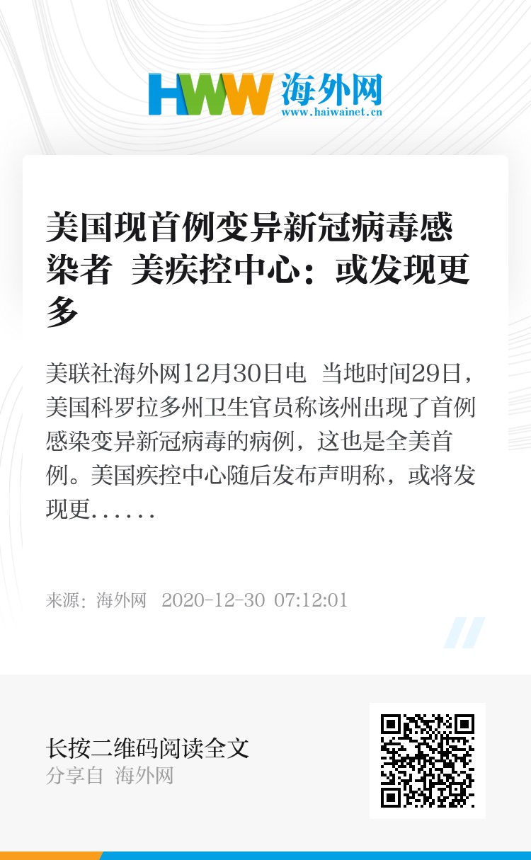 海外网12月30日电 当地时间29日,美国科罗拉多州卫生官员称该州出现了首例感染变异新冠病毒的病例,这也是全美首例。美国疾控中心随后发布声明称,或将发现更多变异新冠病毒感染病例。