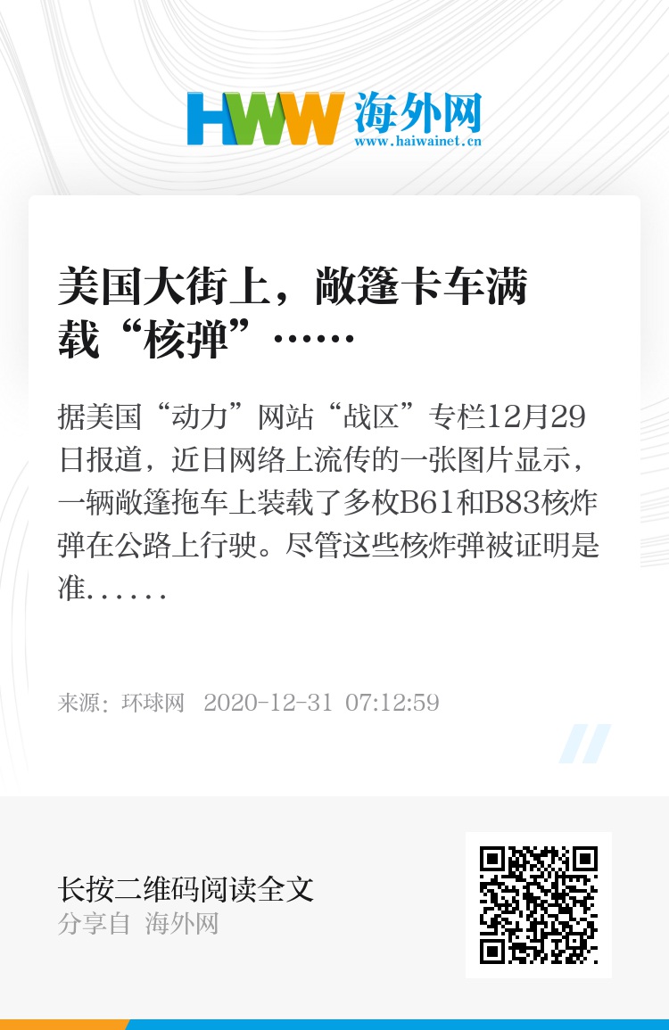 据美国“动力”网站“战区”专栏12月29日报道,近日网络上流传的一张图片显示,一辆敞篷拖车上装载了多枚B61和B83核炸弹在公路上行驶。尽管这些核炸弹被证明是准备用于测试的惰性炸弹,但这样一番“核弹上路”的场面还是引起了不小关注。