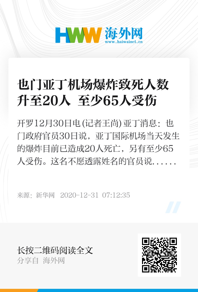 新华社开罗12月30日电(记者王尚)亚丁消息:也门政府官员30日说,亚丁国际机场当天发生的爆炸目前已造成20人死亡,另有至少65人受伤。