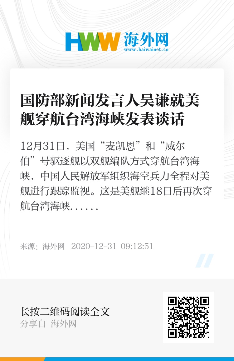 31951498,.国防部新闻发言人吴谦就美舰穿航台湾海峡发表谈话,.2020-12-31 09:47:51,.204476,.李晓航、安再尔江•艾合买提