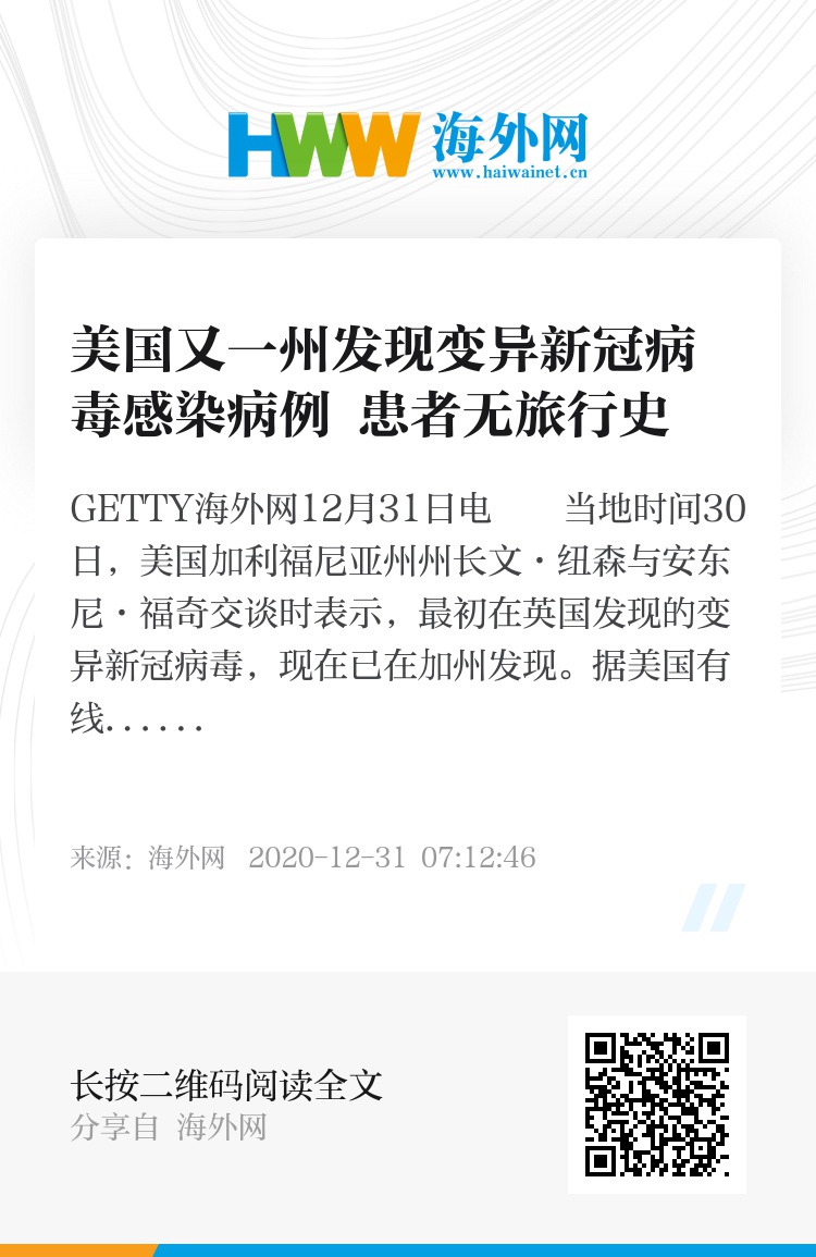 据美国有线电视新闻网(CNN)报道,纽森表示:“我们被告知,昨天(29日)在科罗拉多州发现的这种变异新冠病毒,已经出现在加利福尼亚州,就在南加州。”当地官员随后证实,患者为一名30岁男子,无旅行史,于12月27日开始出现感染新冠病毒的相关症状。
