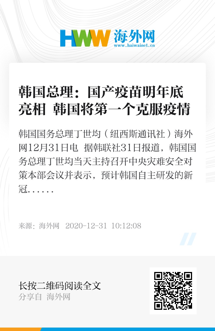 海外网12月31日电 据韩联社31日报道,韩国国务总理丁世均当天主持召开中央灾难安全对策本部会议并表示,预计韩国自主研发的新冠疫苗有望明年(2021年)年底亮相。