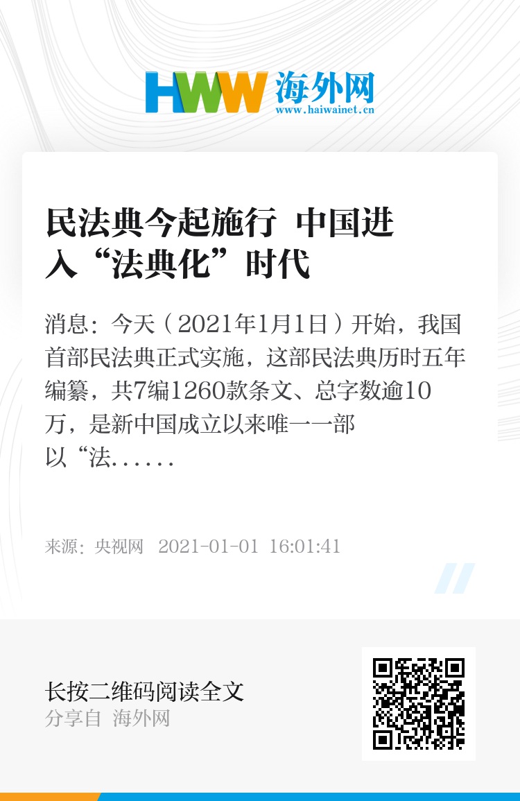 央视网消息:今天(2021年1月1日)开始,我国首部民法典正式实施,这部民法典历时五年编纂,共7编1260款条文、总字数逾10万,是新中国成立以来唯一一部以“法典”命名的法律,标志着我国正式进入法典化时代。