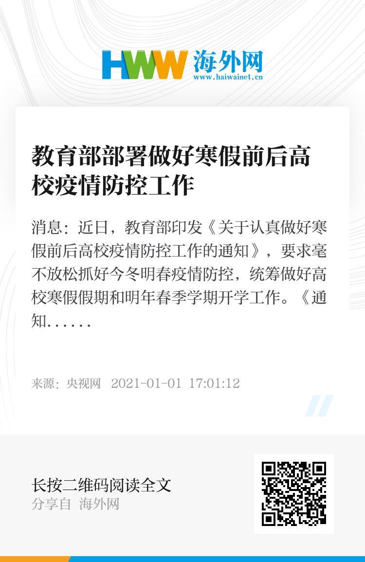 央视网消息:近日,教育部印发《关于认真做好寒假前后高校疫情防控工作的通知》,要求毫不放松抓好今冬明春疫情防控,统筹做好高校寒假假期和明年春季学期开学工作。