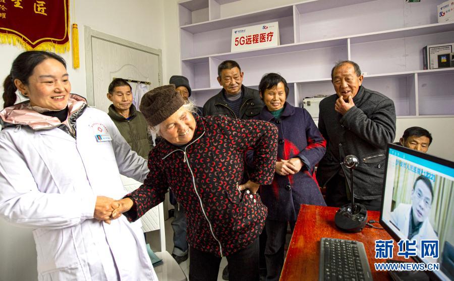 2020年12月3日,安徽省金寨县大湾村村民方临芳(左二)指着自己身体疼痛的部位,在村医袁玲(左一)的帮助下向5G远程医疗会诊的专家讲述病情。新华社发(陈力 摄)