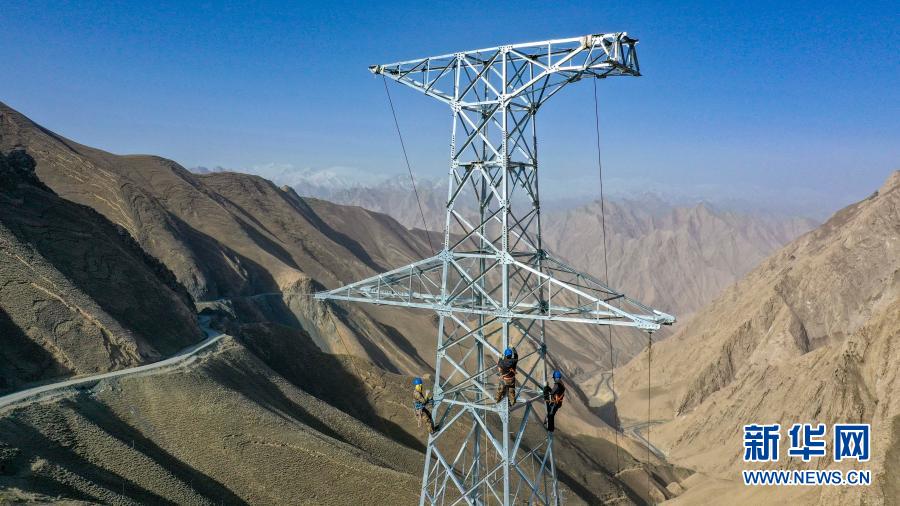 2020年4月28日,在新疆叶城县南部山区海拔3100多米的阿卡孜达坂上,工人登上铁塔检修零部件,为放线做准备(无人机照片)。新华社记者 胡虎虎 摄
