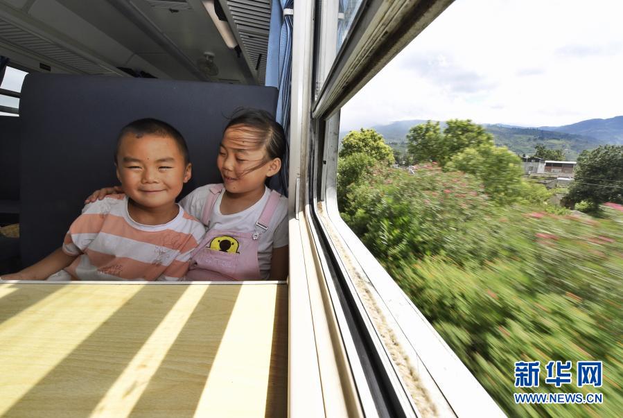 2020年8月14日,吴思语(右)带着弟弟吴思远乘坐“小慢车”前往西昌走亲戚。穿越四川凉山彝族自治州往返于普雄和攀枝花之间的5633/5634次列车,全列13节车厢,走满全程353公里需要9个多小时。慢悠悠的火车沿途要停靠26个站,如同一座流动的村庄,尽自己最大能力解决沿途百姓出行问题。新华社记者 刘坤 摄