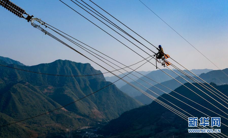 2020年5月3日,施工方国网四川电力送变电建设有限公司的员工在秦岭之巅的高空紧线(无人机照片)。新华社记者 陶明 摄