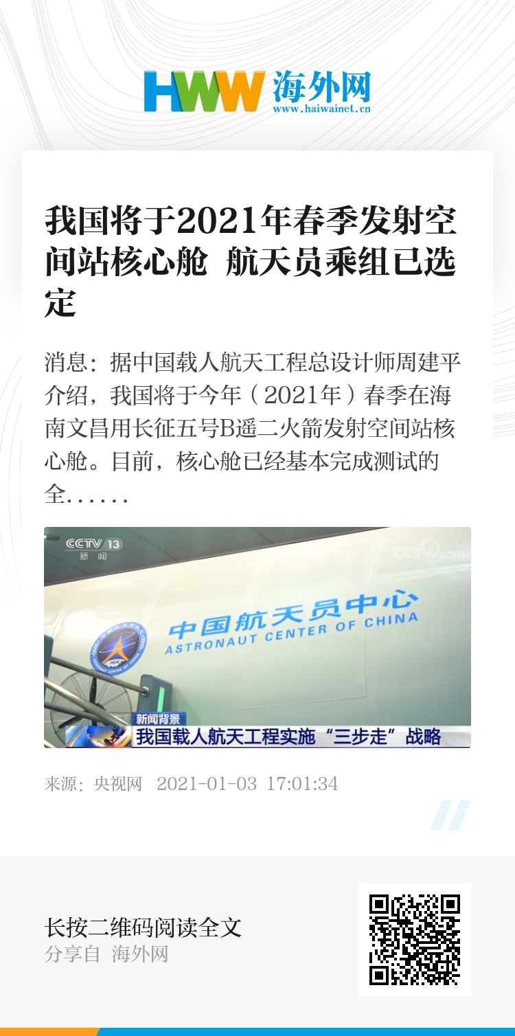 央视网消息:据中国载人航天工程总设计师周建平介绍,我国将于今年(2021年)春季在海南文昌用长征五号B遥二火箭发射空间站核心舱。目前,核心舱已经基本完成测试的全部工作,航天员乘组已选定,正在开展任务训练。