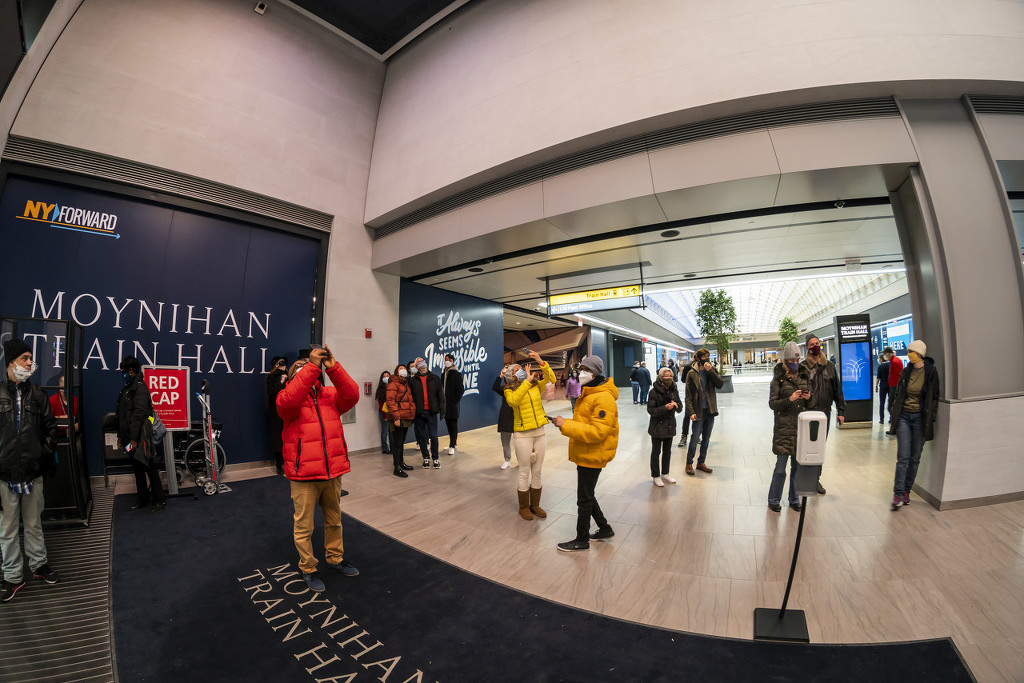 当地时间2021年1月1日,美国纽约,游客在宾夕法尼亚火车站莫尼汉车站大厅。据报道,宾夕法尼亚站是纽约最繁忙火车站,莫尼汉车站大厅是该站的扩建工程,工程建设历时3年耗资16亿美元,于2021年元旦交付使用。莫尼汉车站大厅由纽约邮政总局大楼的邮件分拣区改建而成,如今,具有一百多年历史纽约邮政总局大楼邮政和铁路枢纽功能并行。图片来源:IC photo