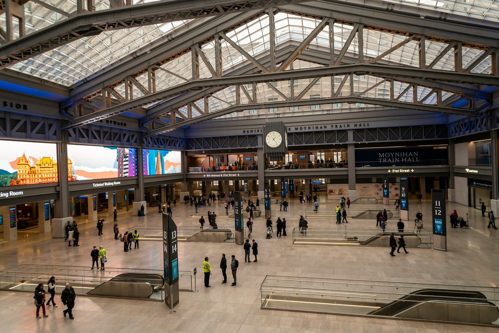 当地时间2021年1月1日,美国纽约,游客在宾夕法尼亚火车站莫尼汉车站大厅。据报道,宾夕法尼亚站是纽约最繁忙火车站,莫尼汉车站大厅是该站的扩建工程,工程建设历时3年耗资16亿美元,于2021年元旦交付使用。莫尼汉车站大厅由纽约邮政总局大楼的邮件分拣区改建而成,如今,具有一百多年历史纽约邮政总局大楼邮政和铁路枢纽功能并行。图片来源:IC photo