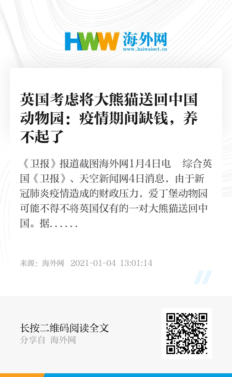 海外网1月4日电 综合英国《卫报》、天空新闻网4日消息,由于新冠肺炎疫情造成的财政压力,爱丁堡动物园可能不得不将英国仅有的一对大熊猫送回中国。
