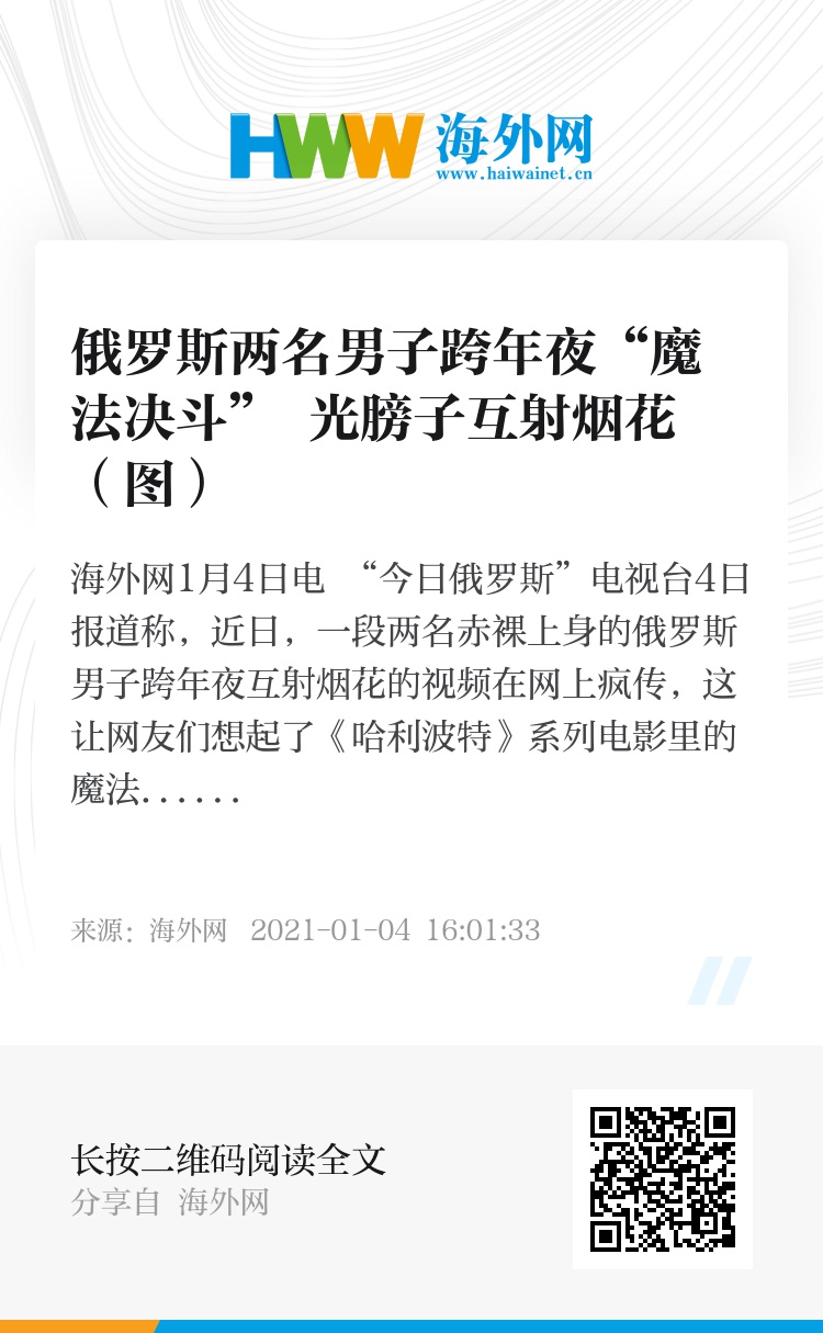 海外网1月4日电 “今日俄罗斯”电视台4日报道称,近日,一段两名赤裸上身的俄罗斯男子跨年夜互射烟花的视频在网上疯传,这让网友们想起了《哈利波特》系列电影里的魔法对决场面。这两人的危险行为已引起警方关注。